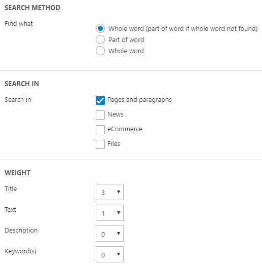 The first items on the app settings are the Search method, Search in and Weight settings (Figure 3.1).