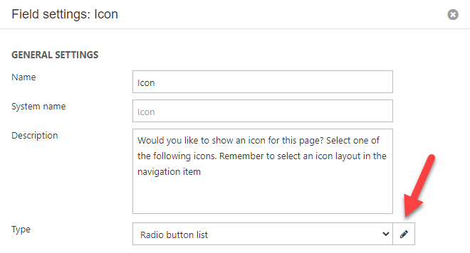To add options to a list you click the pencil-icon next to the Type field of the item type (Figure 8.1).