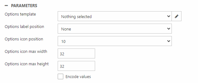 - Folder – you select a folder, the files inside this folder are then used to generate list options. If the files are images of the types .svg .png .jpg or .gif, the images are rendered as icons, with a width, height and in a grid as specified using the field parameters. Otherwise, the file names without the file type will be used as the list options and the full URL to the file as the value.