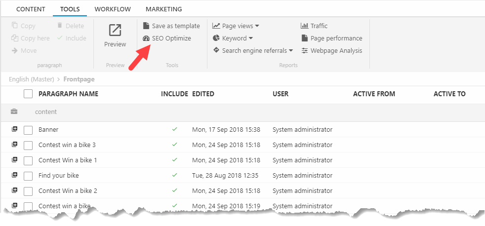 The SEO Optimize tool is a small tool which can help you with website optimization, improving your Google page ranking and by extension your sales and conversion rate. It is available from the Tools menu in the Page ribbon bar (Figure 1.1).