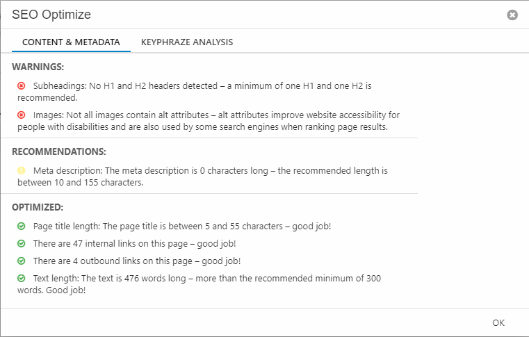 - A Keyphrase analysis tab which can be used to analyze how the page performs in relation to a certain keyword or keyphrase