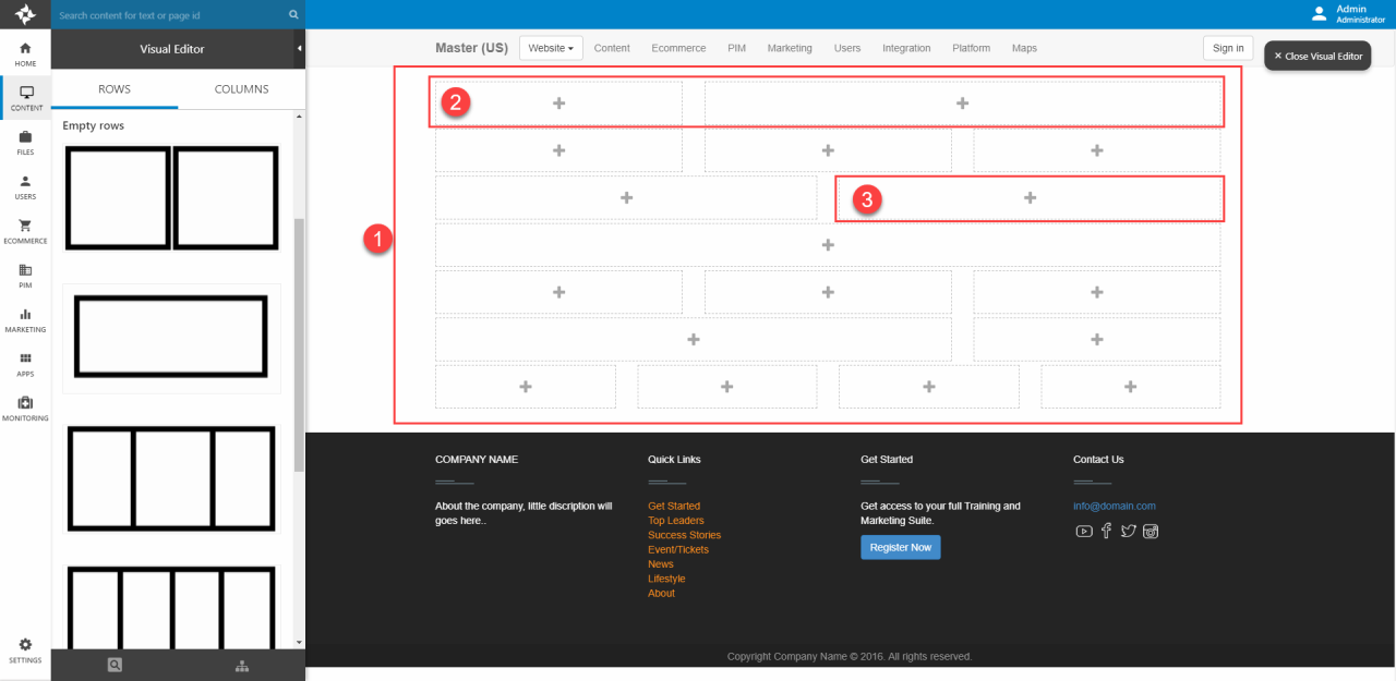 Visual Editor is a tool in Dynamicweb empowering the user to create content in a visual way, by having the page as the workplace (3) and then dragging different building blocks – predefined rows (1) and columns (2) – onto it. In this way, the user can immediately see what the finished page would look like in frontend.