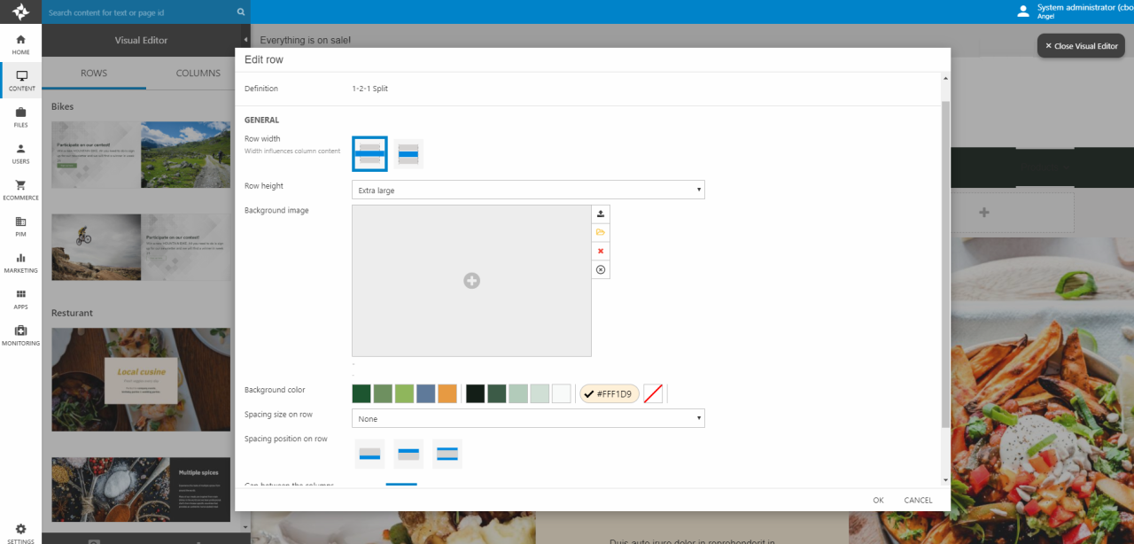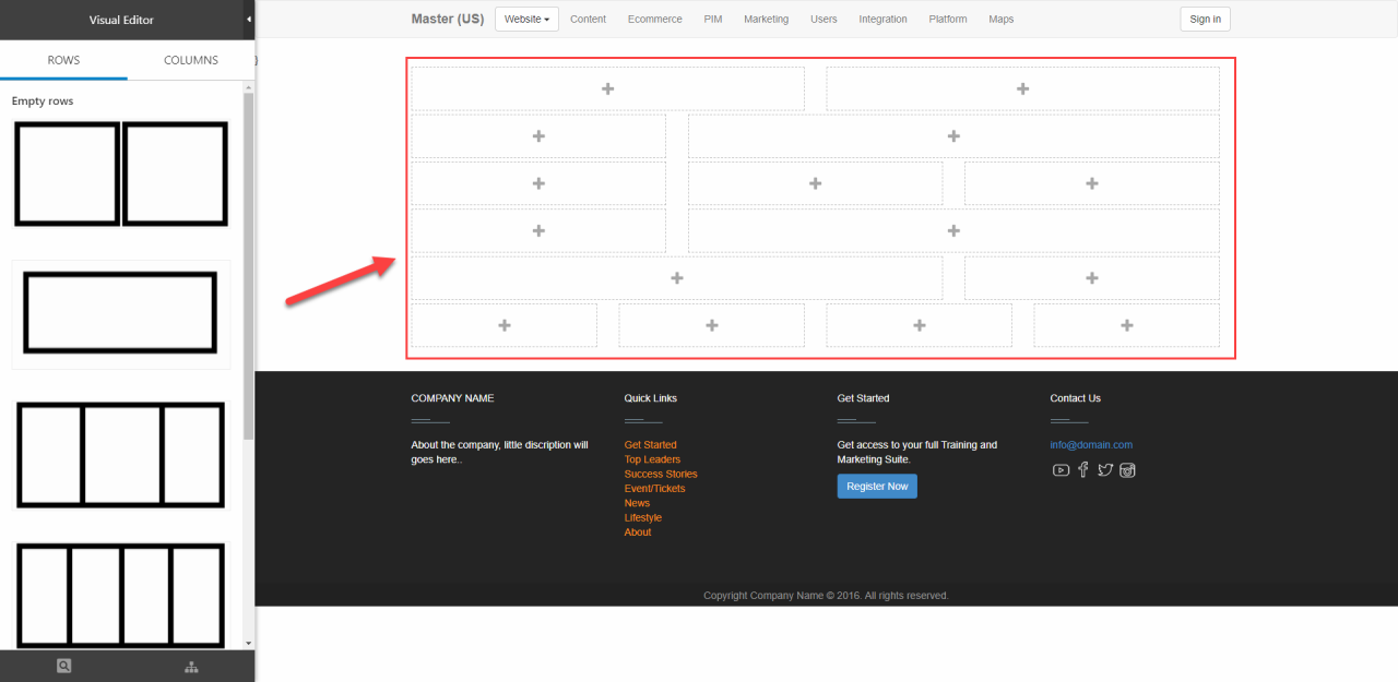 When the rows & row templates are defined you can open the Visual Editor and drag and drop some rows onto a page (Figure 4.1). The rows are empty, of course – so let’s talk content.