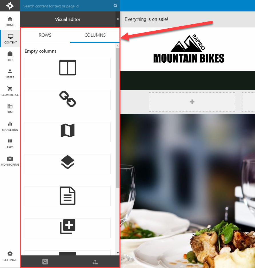 Content is created by dragging and dropping columns onto the grid – basically an item-type enabled for paragraphs. All paragraph item types available in the context where the Visual Editor is used will show up in the Columns panel (Figure 5.1).