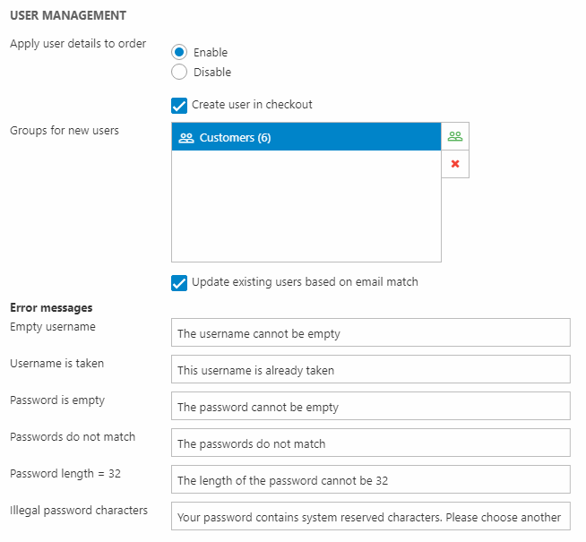- Create user during checkout – this option creates users during checkout. Additional settings are available when this setting is enabled: