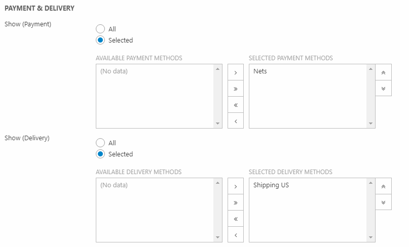 To make a payment method or shipping method available for a cart, move it from the list of available methods (left column) to the list of selected methods (right column).