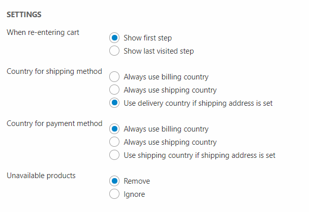 - How the cart selects which shipping and payment methods should be available – the options being billing country, shipping country, or shipping country if a shipping address has been selected.