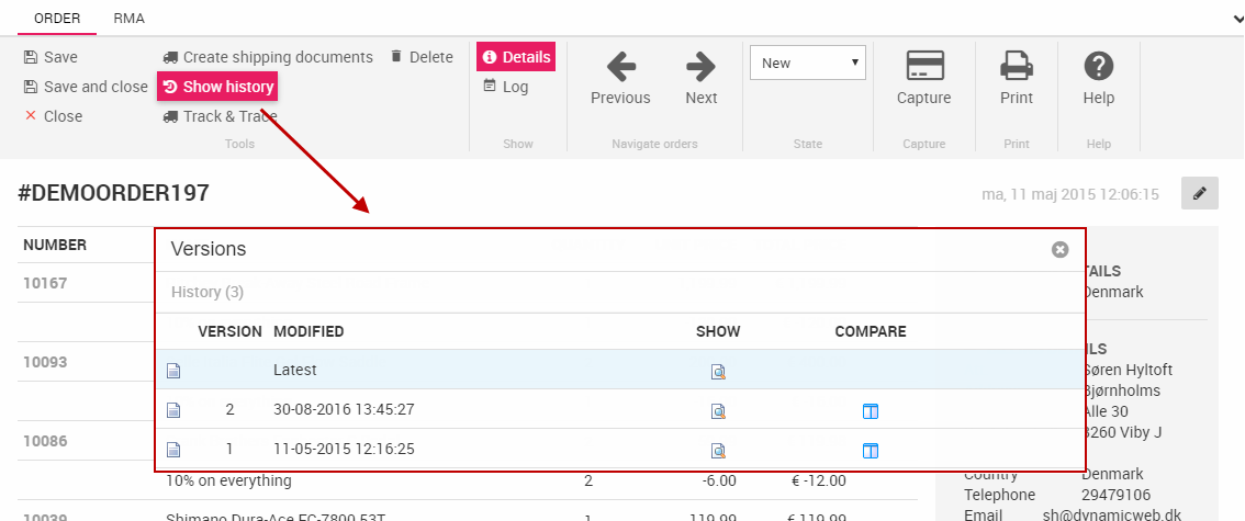 You can view previous versions of an order by pressing the show history button (Figure 11.1).
