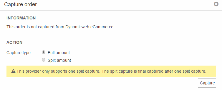 If the provider is setup to only authorize the payment, all incoming orders are set to Not captured in the order list when successfully completed. A few providers don’t support capture from external services like Dynamicweb. They are listed with Not supported and you need to capture the payment from the administration at the provider website. - Captured