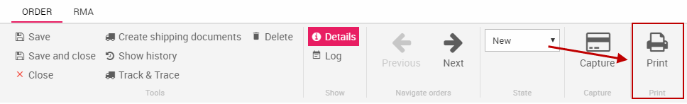 Orders can be printed from both the order list and the order details view – to do so press Print in the ribbon bar in either view (Figure 2.1).