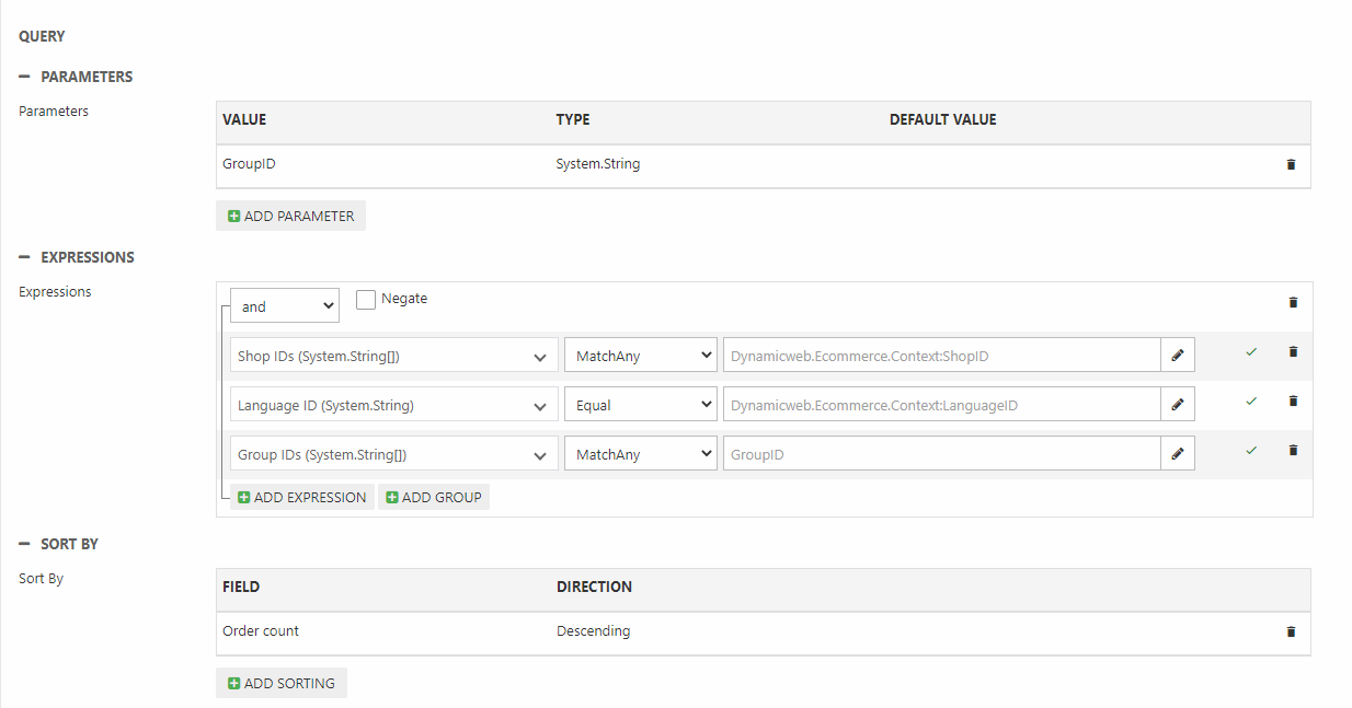- Add an expression where GroupIDs contains a value matching the GroupID parameter value