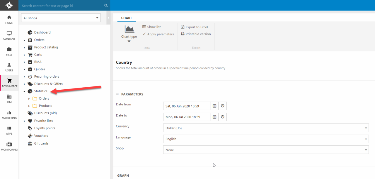 For each report you can select a timespan, a shop, and other relevant parameters, e.g. a currency or an ecommerce language.