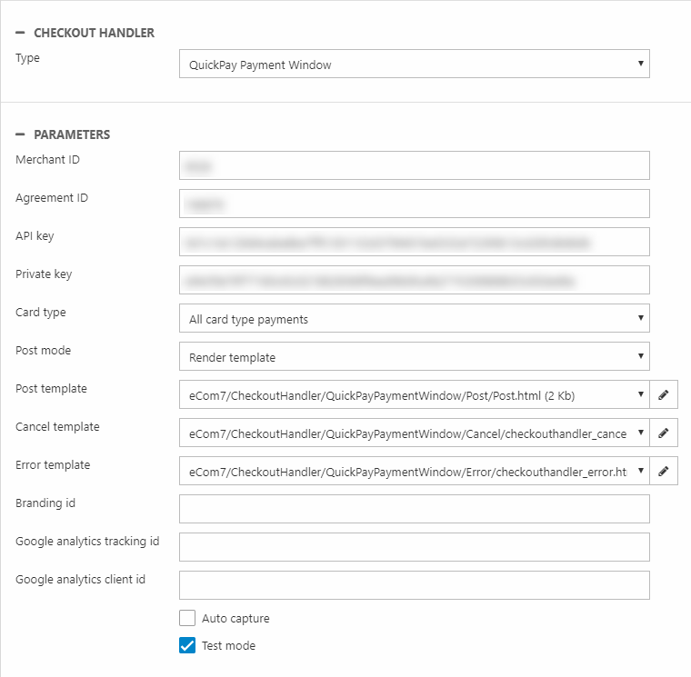 - Supply the Merchant ID, Agreement ID, API Key and Private key from QuickPay