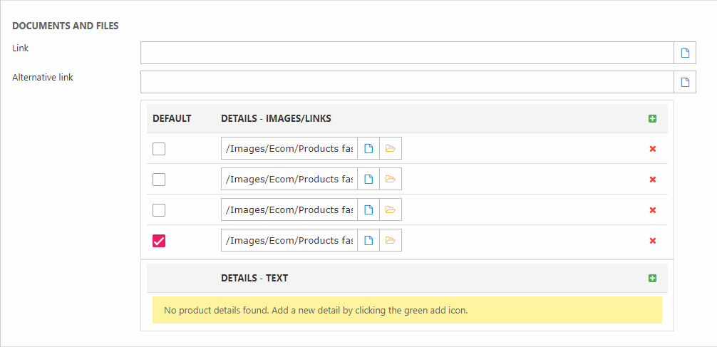 As an alternative to the Small, Medium, Large product fields you can use the Details – Images/Links section to add as many images to a product as you want to, and to mark one of them as the Default image (Figure 3.1).