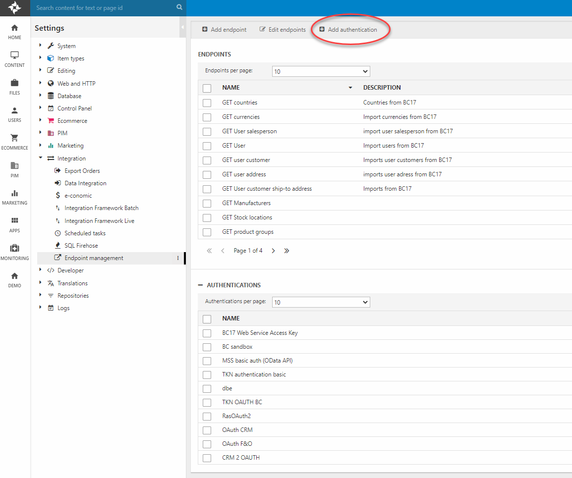 Endpoint authentications are managed in Settings > Integration > Endpoint Management.