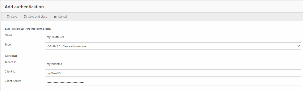 Just like an S2S OAuth, a User impersonation setup requires a TenantID, a Client ID and a ClientSecret from Azure Active Directory, but in addition to these, an access token is required to authorize access to the remote system. Access tokens are obtained via the credentials of a user in the remote system and the authorization will mirror the permissions tied to that exact user. Which data can be accessed and modified through the authentication will thus depend on the credentials configured for the impersonated user.