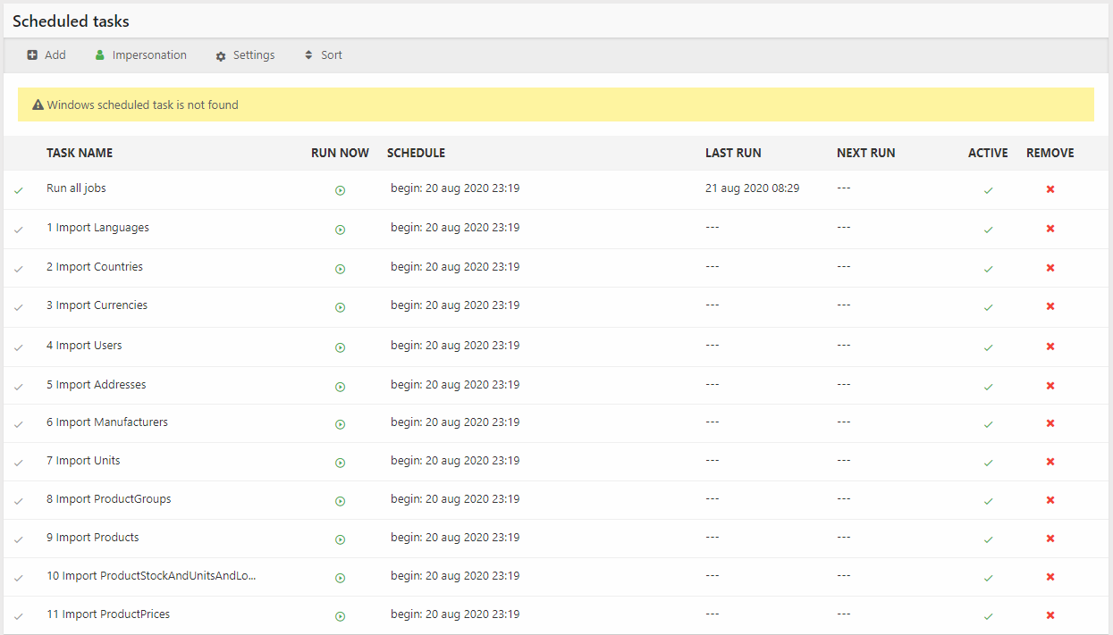 The easiest way to test this is by asking the tool to generate a set of data integration jobs and scheduled tasks inside the /Files/Integration folder. Then, in Dynamicweb, you can run these auto-generated tasks and check if they fail (Figure 5.2).