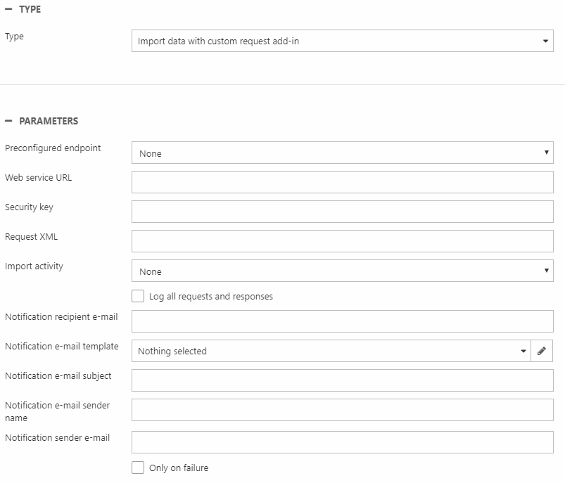 The import data with custom request add-in (Figure 1.1) is used to submit custom requests against e.g. a modified remote system plugin.