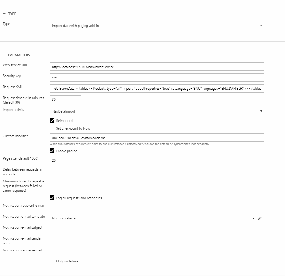 The import data with paging add-in (Figure 1.1) is used to connect to remote systems which support paging requests, reimport requests, etc. Currently this is true for all Integration Framework v2 plugins (D365 BC & D365 FO), although Business Central only supports pages requests when importing products.