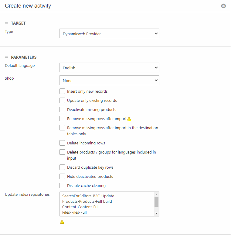 Finally, the Dynamicweb Provider supports updating your indexes every time an activity has been run - this may have a temporary impact on performance every time an import is run.