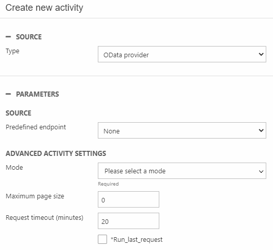 - Request timeout: Takes a value of minutes that sets a timer on how long the activity is allowed to run before it is automatically aborted.