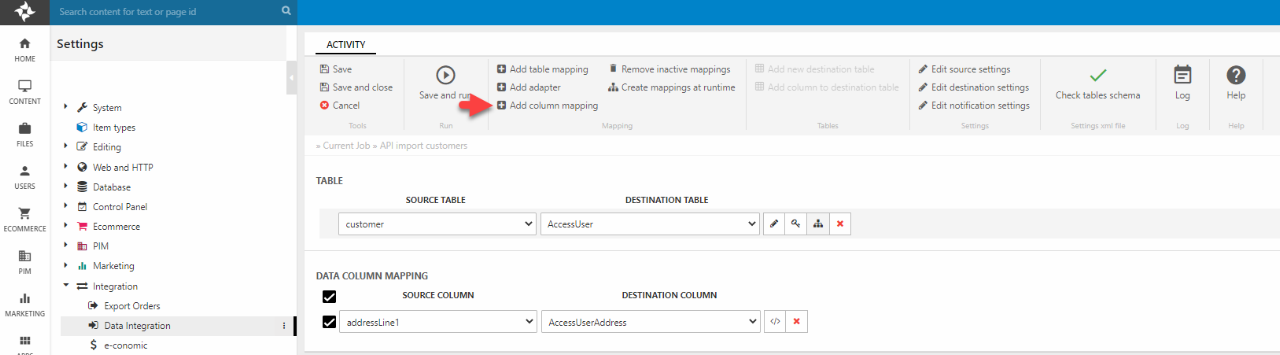 When the endpoint has been set up, the next step is to add an integration activity in Settings > Integration > Data Integration > New Activity.