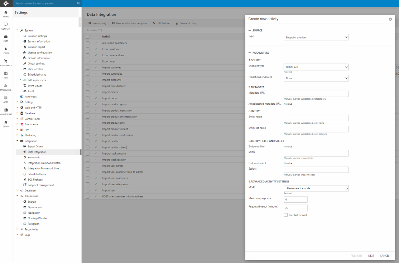 The following guide is an introduction to setting up data integration activities in Dynamicweb using an OData API.