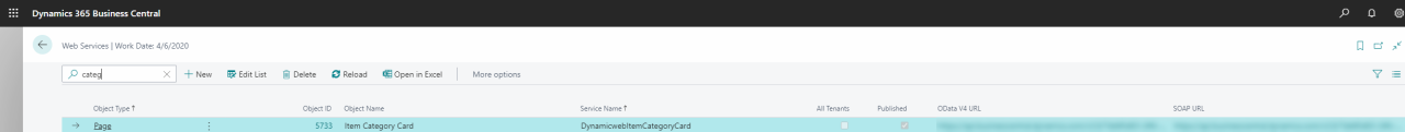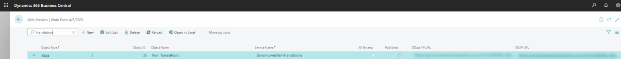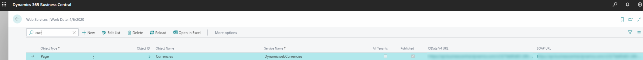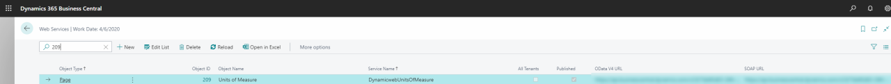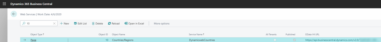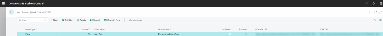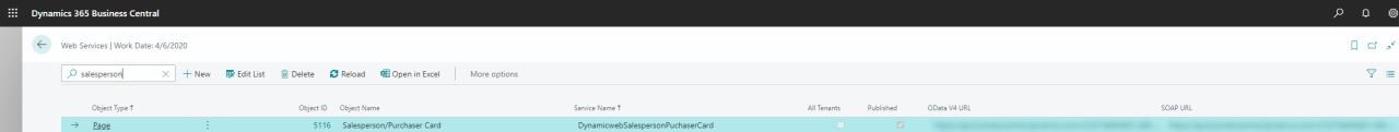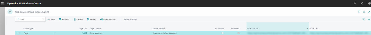 - Locate and copy the OData v4 URL in Business Central Web Services (see below)
