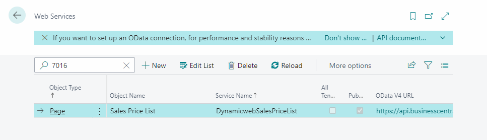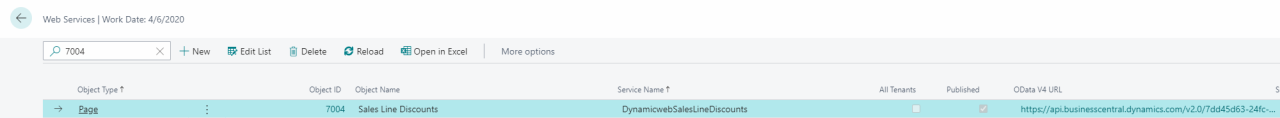 - Append "Lines" to the located URL - for example, if your Business Central web service is called MySalesPriceList the URL inserted should end with MySalesPriceListLines