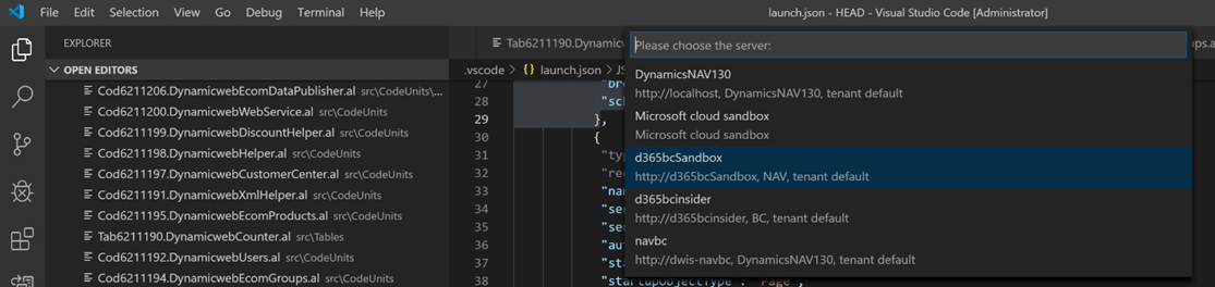 After that you need to edit the file .vscode\launch.json - In the “configurations” section add your Business Central server connection info. If you are using MS docker image with Sandbox environment your configuration section may look like this: