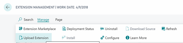 To publish the app just compile the project from VS code and once it is compiled under your D365BC server it will be published there automatically. If you cannot use the VS code you can use powershell and commands that are described here. If you already have the compiled app and want to publish it on the Cloud server you can use the standard functionality from “Extensions” page and choose “Upload extension” (Figure 8.1).