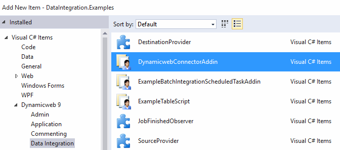 - Select the Dynamicweb 9 > Data Integration > DynamicwebConnectorAddin template (Figure 2.1)