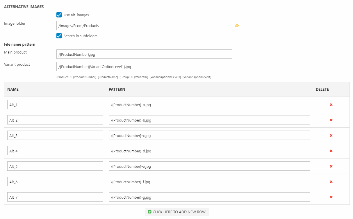 Image patterns – or alternative images – are a way for you to automatically match images in a folder with products in PIM. This is done by defining a pattern – e.g. /{ProductNumber.jpg} – and a folder in the PIM Warehouse settings (Figure 4.1).