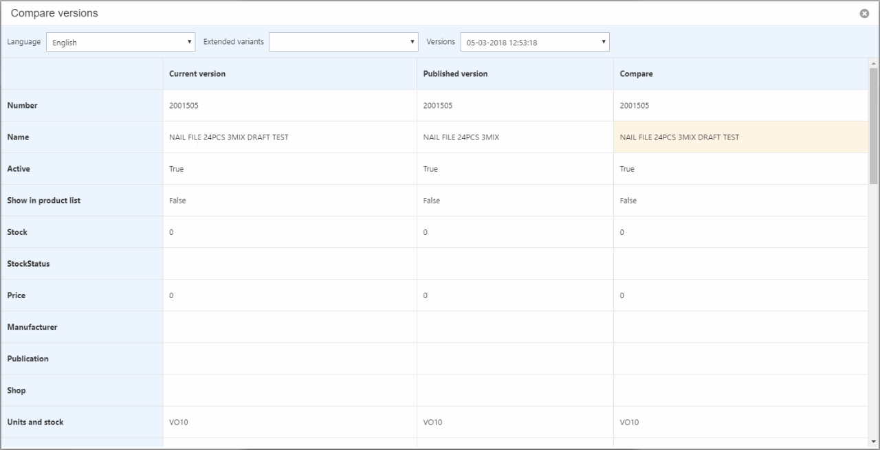 The Compare column will highlight any changes between the current (draft) version and the published version.