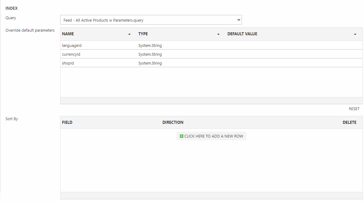 For all intents and purposes you can select any index query, but you should note that if you plan to use the Context section to set the language, currency & shop context the query should be configured to receive the values passed from the feed. This can be done by creating two parameters: