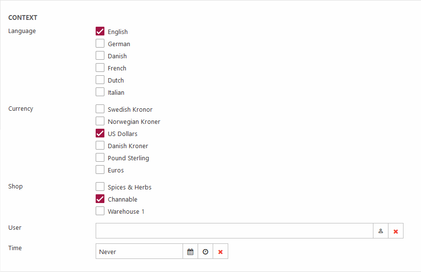 The context section (Figure 3.1) is used to set the feed context when retrieving product data and looking up prices and variants.