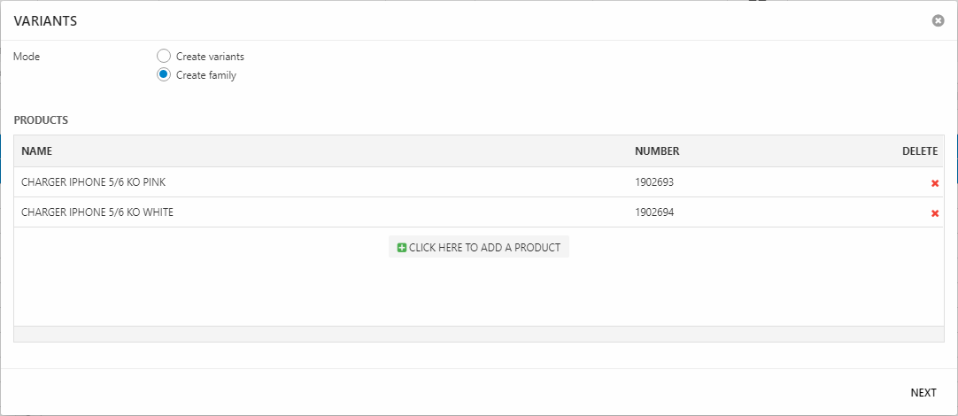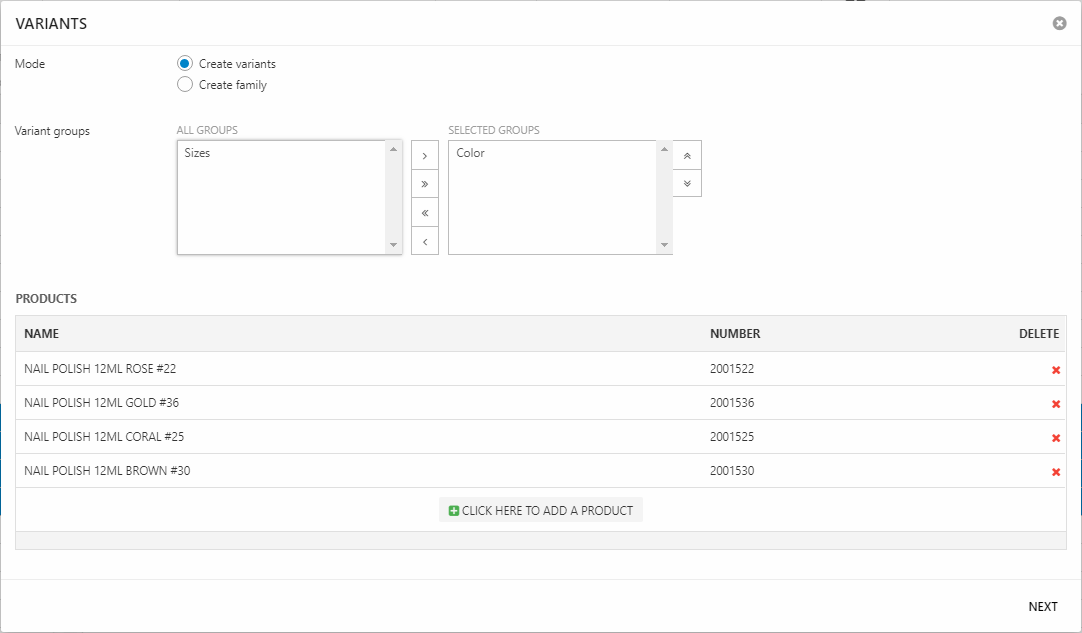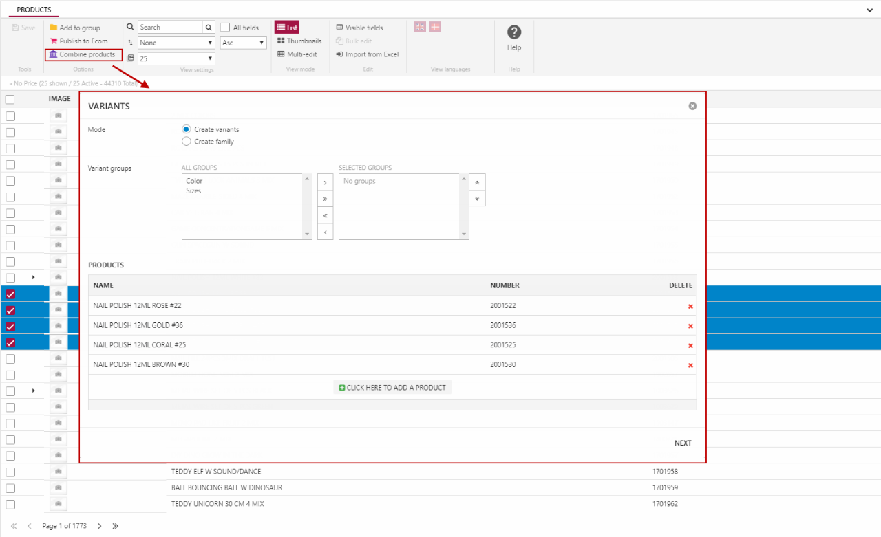 Please note, that you cannot add new variant products using this view - this is only intended as a tool for combining existing products.