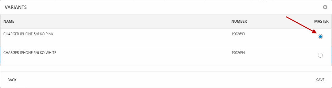 When combining a set of products as variants (Figure 2.1), you will select one or more exisiting variant groups and assign a variant option to each product, e.g. Large or Black.