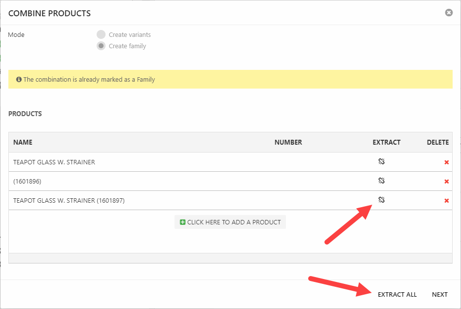 If a product family has been created using the Combine tool, you can also use the tool to extract variants from the group – this creates regular products from the variants. You will be given a choice between deleting the master product when all variants have been extracted or keeping it around as a regular product.