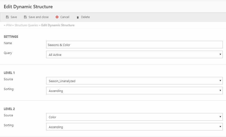 To create a structure query go to PIM > Structure queries and Open a context menu and press New dynamic structure to open the edit interface (Figure 1.1).