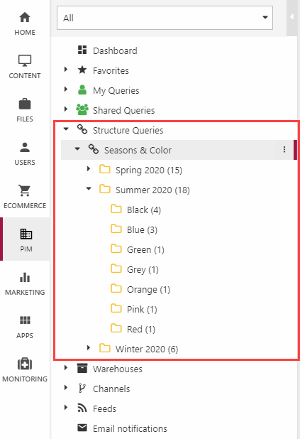 - Select a PIM query to base the structure on – the products matched by that query will be part of the structure