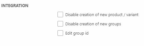 The Integration settings (Figure 13.1) are useful if you integrate with an ERP system e.g. NAV or AX. With the settings, you can limit the available actions from the Dynamicweb backend, to ensure that the ERP system has full control over your product catalog: