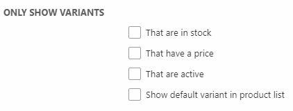 With the Only show settings (Figure 7.1), you can control how products and variants are displayed across product catalog apps by setting up requirements for showing products in frontend: