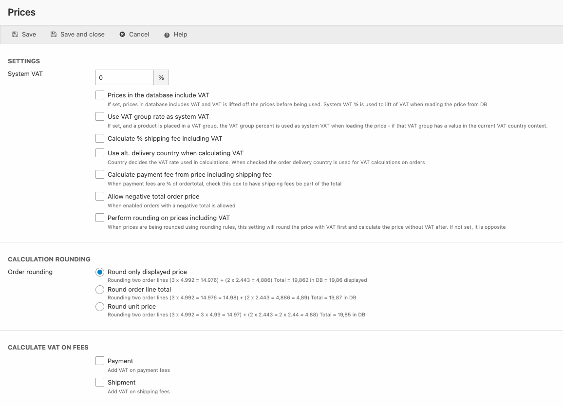 Prices in the database include VAT If set, prices in database includes VAT and VAT is lifted off the prices before being used. System VAT % is used to lift of VAT when reading the price from DB