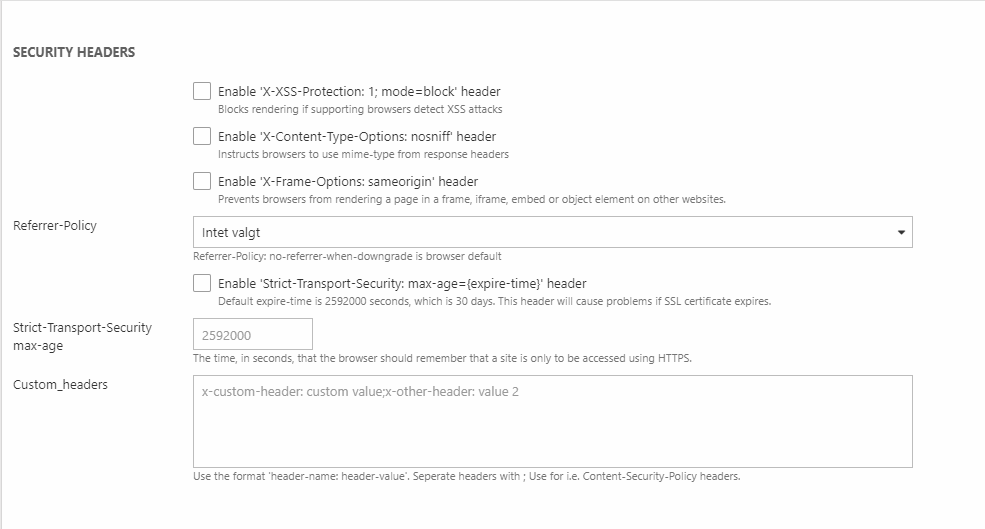 The Security Headers section (Figure 4.3) allows you to enable or disable several different security-specific headers in http request headers.