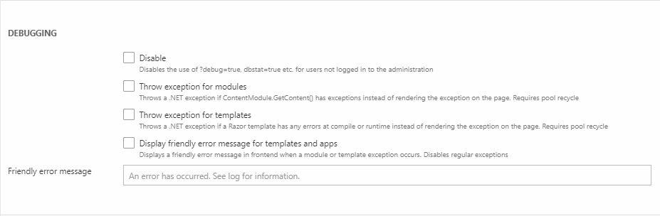 • Throw exception for templates – forces the system to throw .NET exceptions instead of rendering the Razor exception on the page