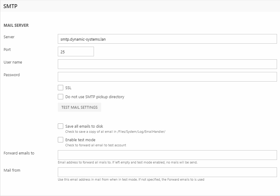 • mail server address - you can add more than one using ";" as a separator (e.g. smtp.yourdomain.dk;mail.yourdomain.dk)