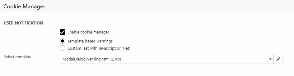 - Select either Template based warnings and a Template (recommended) or Custom. You can also select a template at the website level using the cookies button in the Websites app. This will override the template set here.