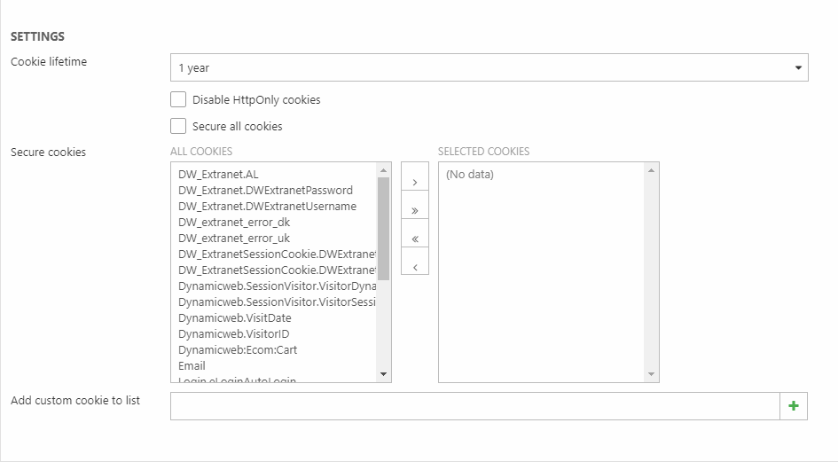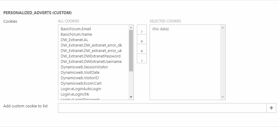 Finally, you can add custom cookies to the list – this is only necessary if your cookie is set via custom code. Cookies set via our API (using the CookieManager.SetCookie method) are added to the list automatically.