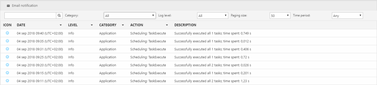 Each event is listed with key data – Date, Level, Category, Action, and a Description – and the list can be filtered or searched.